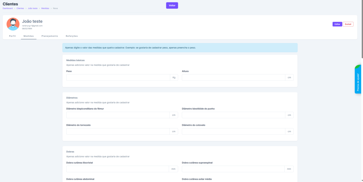 Na tela de cadastro de medidas, você deve preencher apenas as medidas que deseja cadastrar. Exemplo: se for só a altura, você apenas preenche a altura e salva.