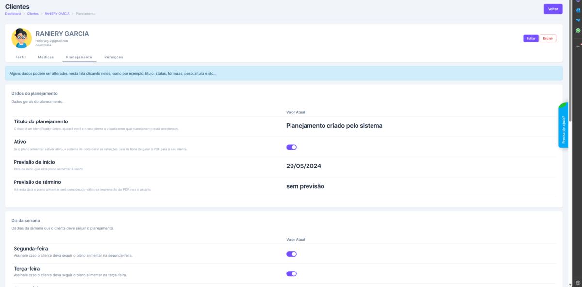 O planejamento é onde você irá cadastrar todos os parâmetros para geração do plano alimentar.